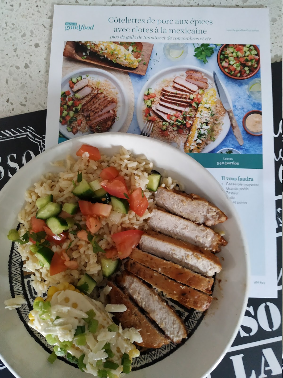 Côtelettes de porc aux épices avec elotes à la mexicaine pico de gallo de tomates et de concombres et riz: